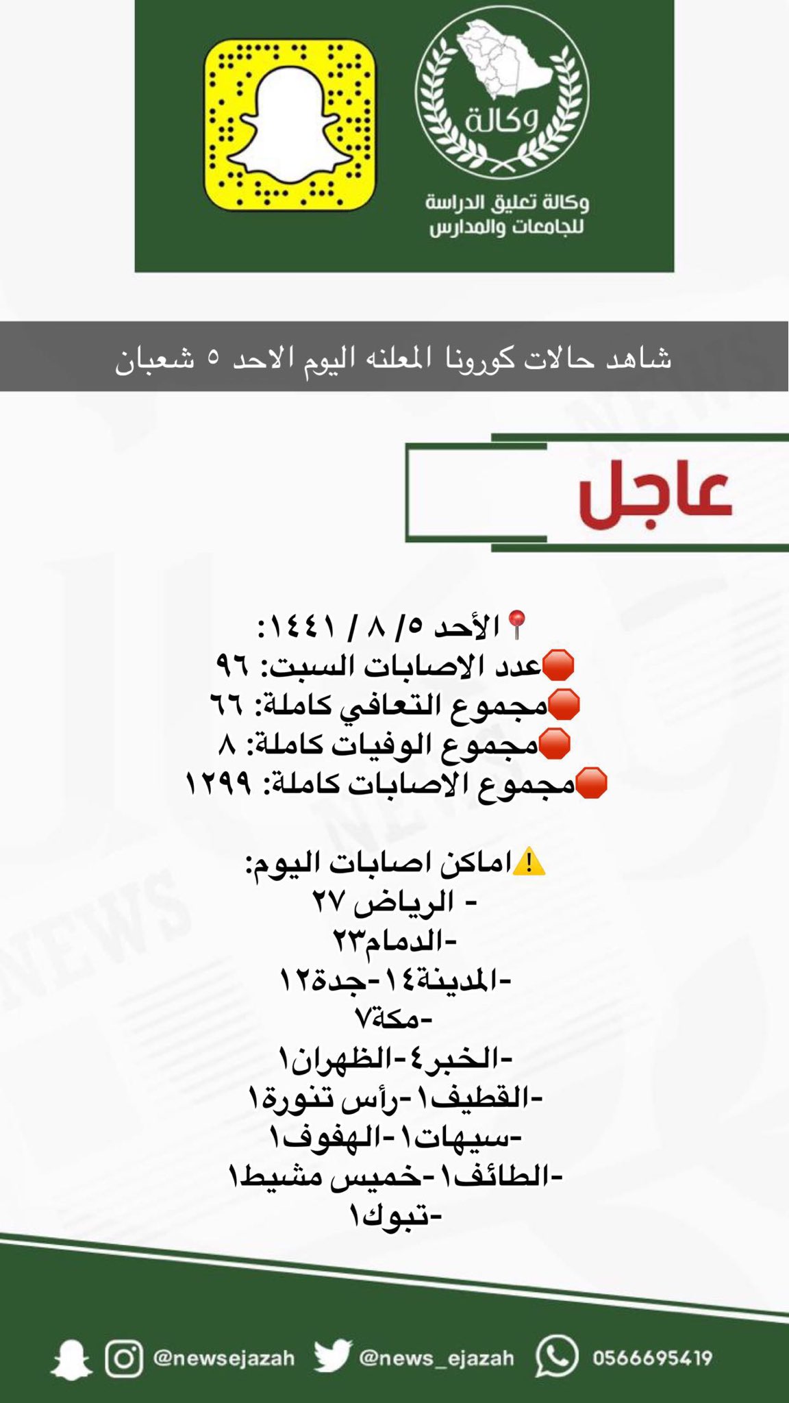 وكالة تعليق الدراسة On Twitter شاهد عدد الاصابات وعدد الشفاء و الوفيات واماكن الاصابات في السعودية فيما يخص فايروس كورونا اليوم الاحد ٥ شعبان