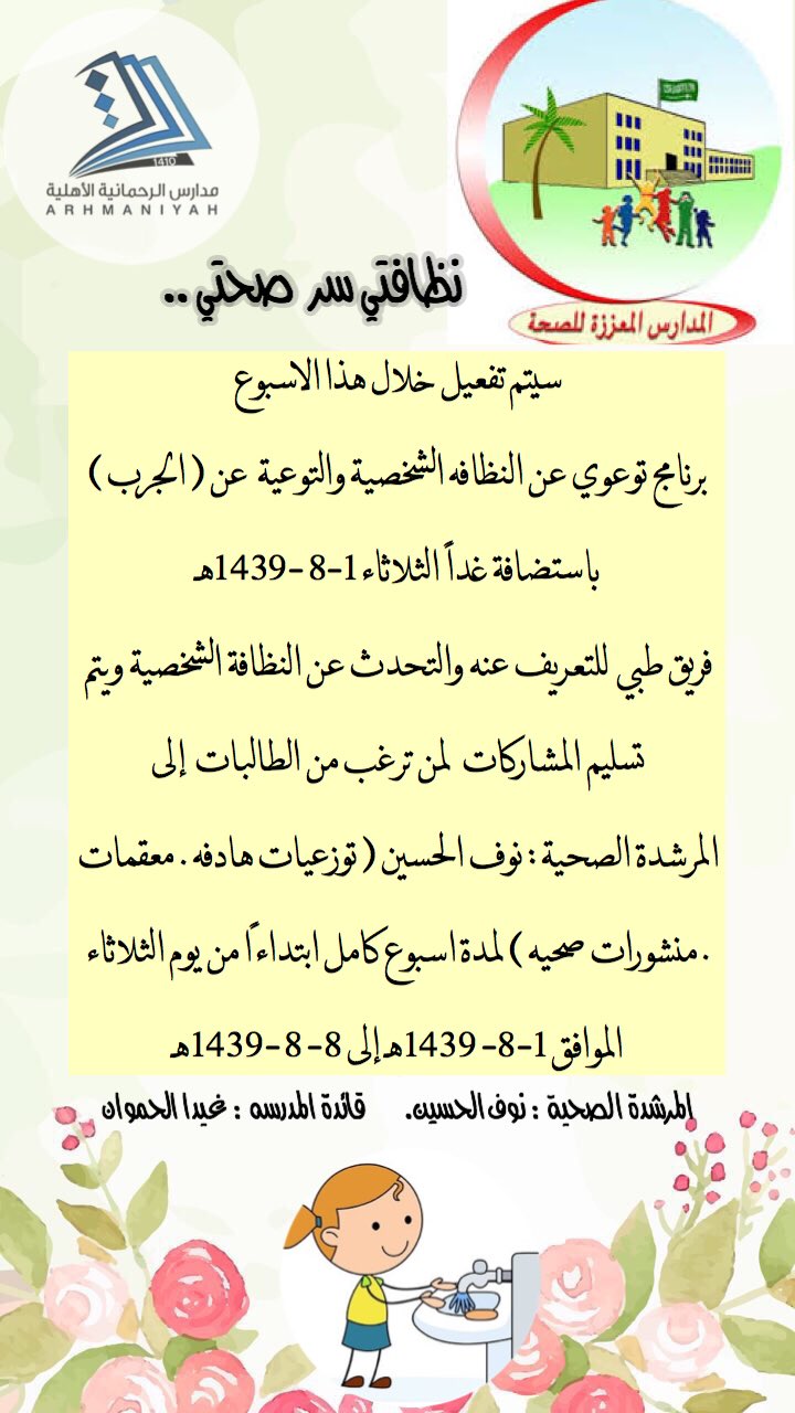 مدارس الرحمانية بنات Ar Twitter تفعيل برنامج نظافي سر صحتي لمدة اسبوع ابتداء ا من غدا النظافة الشخصية والتوعية عن الجرب بإستضافة فريق طبي للتحدث والتوعيه عنه مدارس معززة للصحة الصحة مدارس الرحمانية Aljouf Healths Ienjoufedu